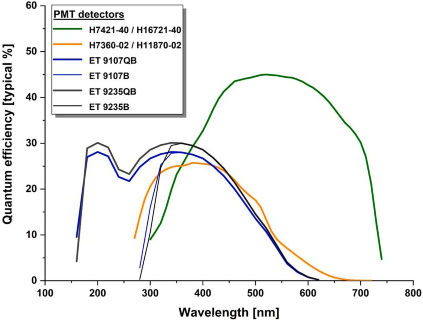 6.1. 光電倍增管(PMT):多種PMT可供選擇,根據(jù)波長(zhǎng)檢測(cè)范圍和量子效率適配不同實(shí)驗(yàn)。 不同PMT的典型量子效率(%)