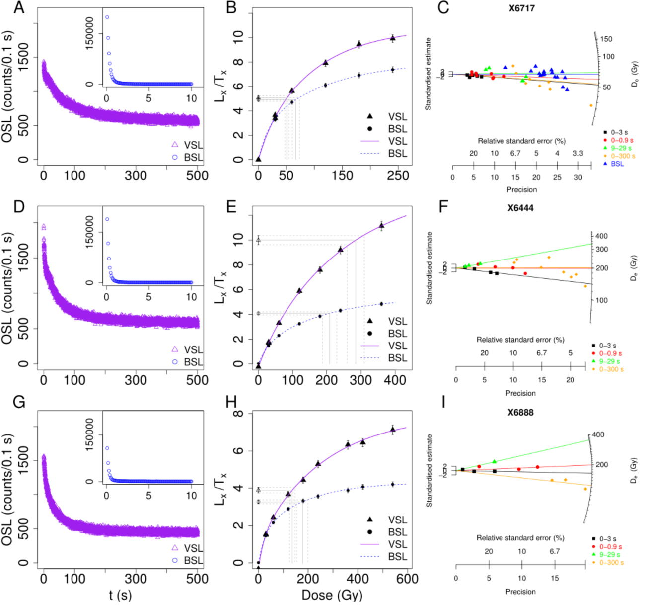 圖1 .X6717 (A、B、C)、X6444 (D、E、F)和X6888 (G、H、I)的SAR結(jié)果。(A,D,G)顯示自然信號(hào)衰減曲線(xiàn),紫色三角形代表VSL信號(hào),插圖顯示前面的BSL(藍(lán)色圓圈)用于比較。(B,E,H)顯示了使用長(zhǎng)信號(hào)間隔(0-300s;400-500s BG)的VSL(三角形)和快速間隔(0-0.9s;BSL(圓圈)的90-100s BG。誤差線(xiàn)顯示標(biāo)準(zhǔn)誤差。(C,F(xiàn),I)顯示了四個(gè)VSL信號(hào)間隔的差分分布:0–3秒(背景:3–10.5秒)(黑色方塊)、0–0.9秒(背景:450–500秒)(紅色圓圈)、9–29秒(背景:29–80秒)(綠色三角形)和0–300秒(背景:400–500秒)(橙色菱形)。X6717的BSL De值(藍(lán)色三角形)用于比較。線(xiàn)條表示每個(gè)區(qū)間的凸輪。根據(jù)Dietze和Kreutzer (2017年)修改的徑向圖(R核心團(tuán)隊(duì),2016年)。