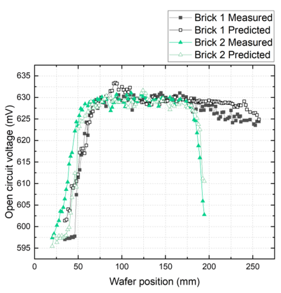 圖 4:比較來(lái)自不同錠的兩個(gè)中心的測(cè)量值(實(shí)心)和預(yù)測(cè)值(空心)(Voc)值與磚高度的關(guān)系。