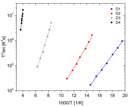 圖 4. 典型的阿倫尼烏斯圖(初始延遲時(shí)間為2 s至 200 s),該圖用于提取激活能以及表觀俘獲截面。激發(fā)采用 940 nm的發(fā)光二極管。