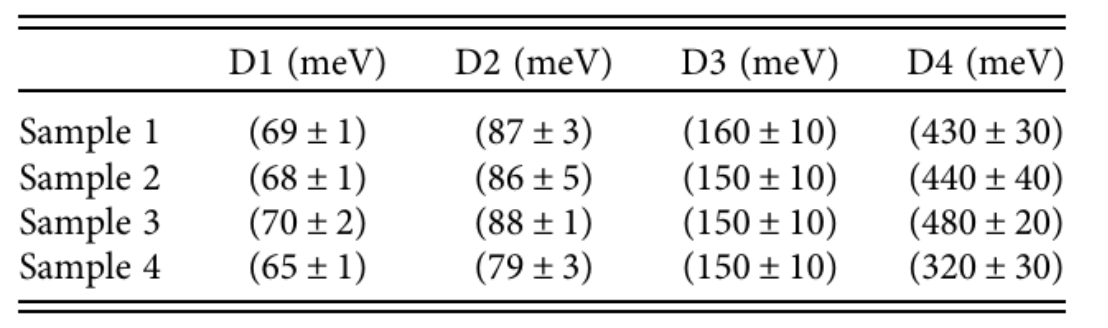 實(shí)驗(yàn)結(jié)果令人矚目。MD - PICTS 技術(shù)成功識(shí)別出三個(gè)具有明確激活能和俘獲截面的陷阱(如圖3),其中兩個(gè)陷阱的激活能低于100meV,這是傳統(tǒng)PICTS技術(shù)此前未曾發(fā)現(xiàn)的(如圖4和表1)。此外,還檢測(cè)到能量更深的陷阱,盡管其激活能變化范圍較大,但依然為研究晶體缺陷提供了重要線索。通過(guò)波長(zhǎng)相關(guān)分析,明確了所有觀察到的陷阱均為體缺陷。同時(shí),該技術(shù)還測(cè)定出少數(shù)載流子壽命約為0.7μs,直觀反映出晶體受中子輻射的損傷程度。
