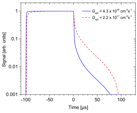 圖 2. 不同光產(chǎn)生速率下的典型瞬態(tài)。兩次測(cè)量均在室溫下對(duì)同一樣品進(jìn)行,使用940nm的發(fā)光二極管(LED)進(jìn)行激發(fā)。