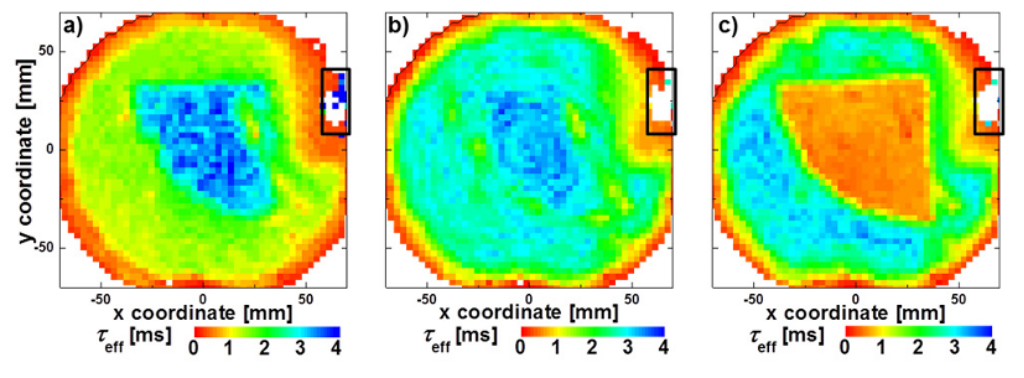 圖 3. 在樣品#B上施加 (a) -1 V、(b) 0 V 和 (c) +1 V 偏置電壓時測得的壽命圖(黑色矩形標(biāo)記接觸區(qū)域)。
