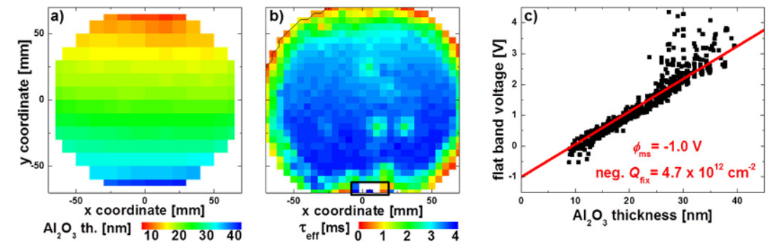 圖 2. (a) Al2O3厚度的橢圓偏振圖和 (b) 具有不均勻Al2O3厚度的樣品#A 在0 V下的壽命圖。黑色矩形標(biāo)記與Si基板的電接觸。(c) 根據(jù)方程1和2,從BiasMDP中提取的Vfb值(黑點)作為Al2O3厚度和線性回歸(紅線)的函數(shù)。通過分析這些數(shù)據(jù)發(fā)現(xiàn),平帶電壓與Al2O3厚度之間呈現(xiàn)出完美的線性關(guān)系。這一結(jié)果不僅與理論預(yù)測高度吻合,更證明了BiasMDP技術(shù)能夠精準(zhǔn)捕捉材料參數(shù)隨厚度變化的細(xì)微差異,為研究鈍化層特性提供了有力的數(shù)據(jù)支持(如圖 2和3)。