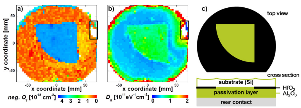 圖 4.使用BiasMDP在樣品#B上確定的(a) Qf和(b) Dit的圖(黑色矩形標(biāo)記接觸區(qū)域)。(c) HfO2界面層沉積期間掩模的位置。