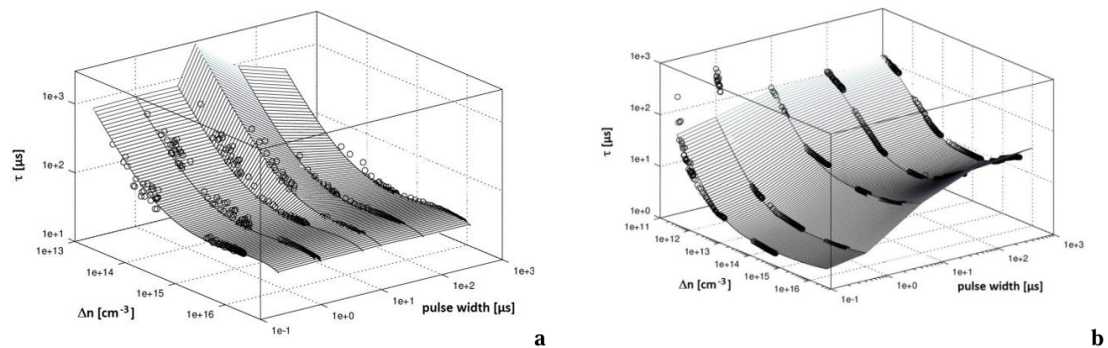 圖3. 用熱氧化物鈍化的6 µm n-Si 外延層 (a)和用非晶Si鈍化的30 µm n-Si外延層(b)在不同脈沖寬度下的注入相關壽命曲線。