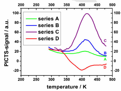 圖6. 通過HT-MDPICTS 檢測具有不同受體濃度的Si GaAs樣品中的EL2d效應。峰高和符號與受體濃度相關。D系列樣品未摻雜,受體濃度從A上升到C。