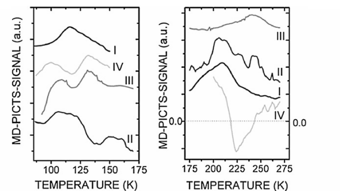 圖5. 不同Si-6H SiC 樣品在不同溫度范圍內(nèi)的MDPICTS光譜比較。樣品I–III在相同工藝條件下生長。