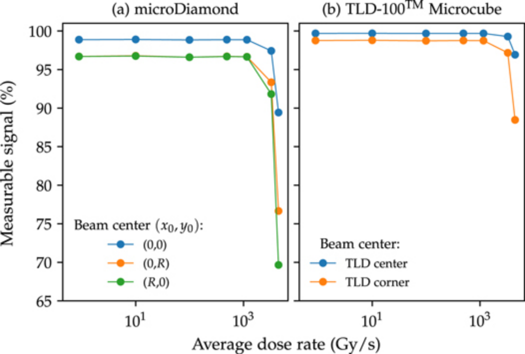 圖1對(duì)(a) microDiamond和(b) TLD-100TM中平均效應(yīng)的評(píng)估??紤]到射到檢測(cè)器中心或檢測(cè)器邊緣的光束,并基于用EBT3薄膜測(cè)量的光束σ,計(jì)算可測(cè)量的信號(hào)(點(diǎn))。r表示微鉆石的半徑(1.1毫米)。由于光束不對(duì)稱,對(duì)于(x0,y0) = (0,R)和(R,0)計(jì)算微鉆石的可測(cè)量信號(hào)。