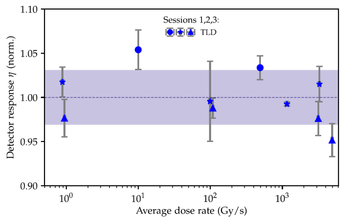 數(shù)據(jù)點(diǎn)均勻分布在±5%區(qū)間內(nèi),驗(yàn)證LiF:Mg,Ti在超高劑量率下的穩(wěn)定性。
