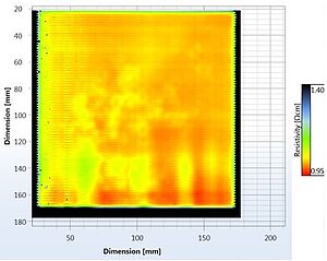 圖2.用于光伏應用的典型mc-Si晶片的電阻率圖,平均電阻率為1.0 Ohm cm