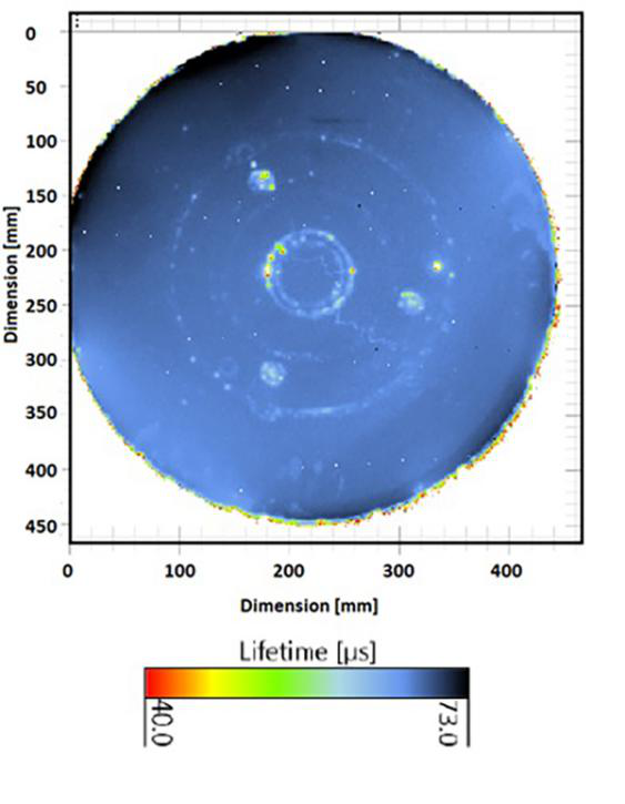 對(duì)于450mm晶片的少數(shù)載流子壽命測(cè)量,基本上使用了與德國(guó)Freiberg MDPmap和MDPpro相同的測(cè)量頭,但對(duì)較大的晶圓片尺寸的樣品,掃描工具進(jìn)行了一些調(diào)整。圖1顯示了一個(gè)450毫米晶圓片的第一個(gè)測(cè)量的壽命圖,它清楚地顯示了一些處理痕跡和條紋。圖2和圖3展示了位于Fraunhofer IISB的檢測(cè)結(jié)果。